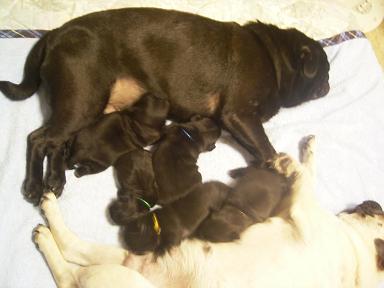 寝ているもんじに向かって子パグ大移動。